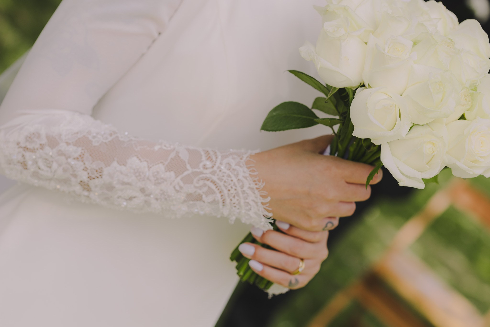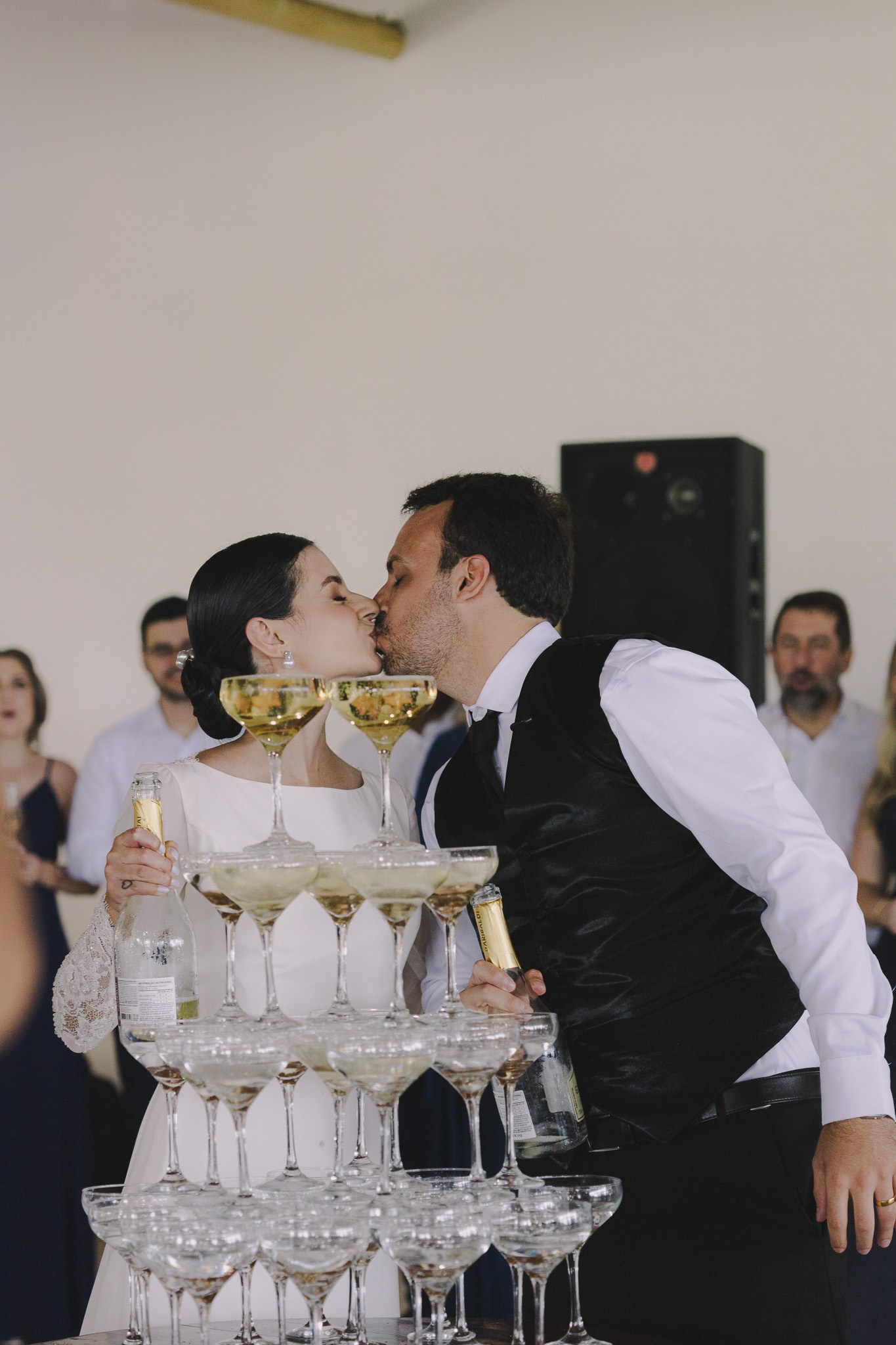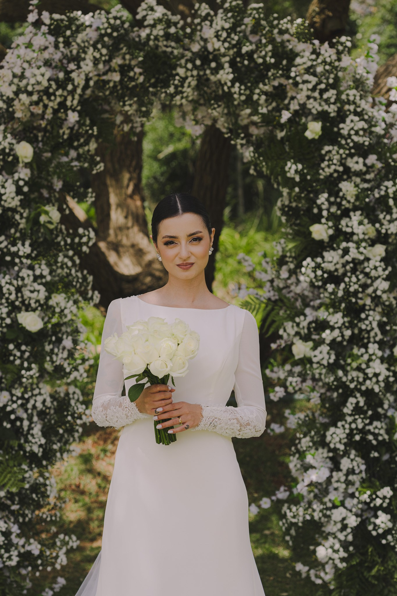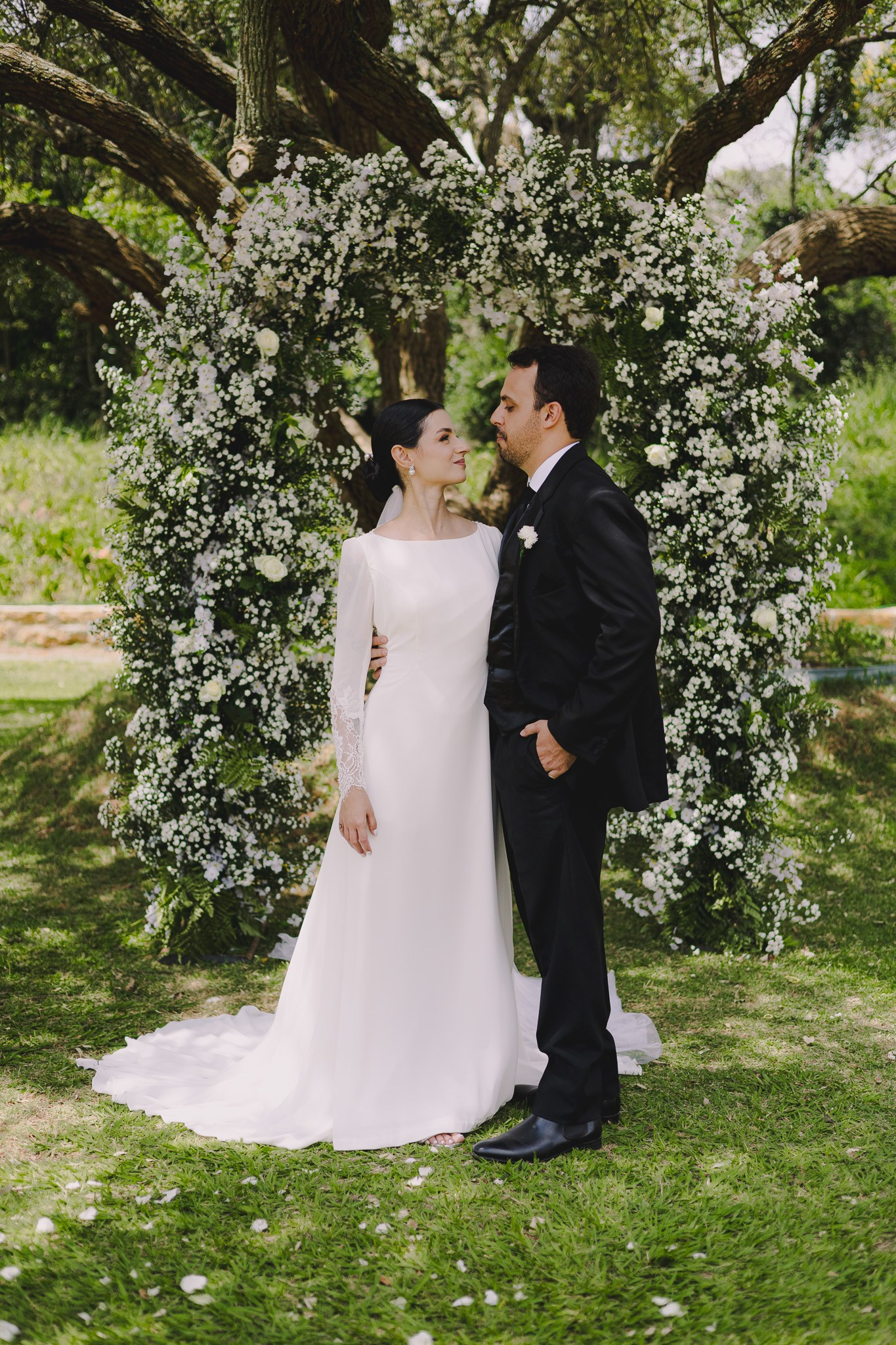 A decoração clássica, o vestido minimalista da noiva e o terno atemporal do noivo tinham uma beleza simples, mas cheia de significado.